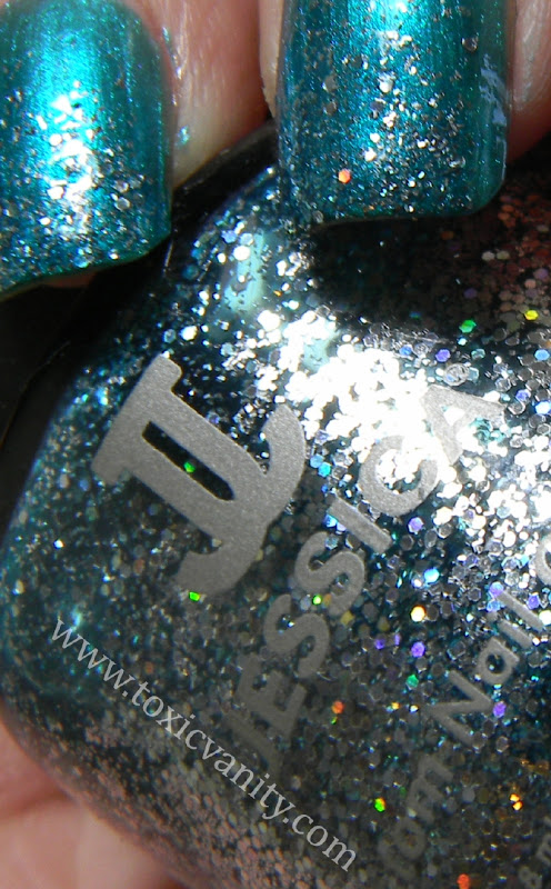 Es un esmalte con mucha purpurina, plateada holográfica, la base del esmalte es turquesa pero no opaca en su totalidad sino más tipo jelly ( sin llegar a serlo).